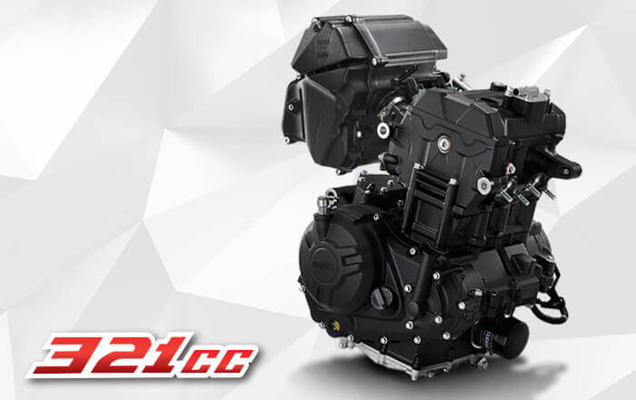 เครื่องยนต์ 321 ซีซี ระบายความร้อนด้วยน้ำ 4 จังหวะ DOHC 2 สูบเรียง เกียร์ 6 ระดับ พร้อมกระบอกสูบไดอะซิลและ เทคโนโลยีวิเคราะห์การเผาไหม้อย่างแม่นยำ หม้อน้ำขนาดใหญ่ เพิ่มประสิทธิภาพให้อัตราเร่งและการขับขี่ได้อย่างสมบูรณ์