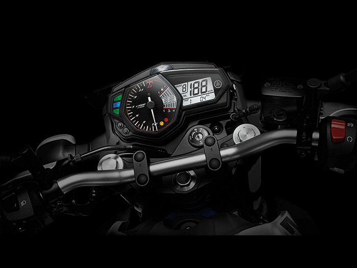 แผงหน้าปัดมัลติฟังก์ชั่นสไตล์ซูเปอร์ไบค์ลงตัวกับแฮนเดิลบาร์ พร้อมระบบวัดรอบแบบ Electric กับสปีดมิเตอร์แบบ Digital ได้อย่างลงตัว พร้อมไฟเตือนจังหวะเปลี่ยนเกียร์ (Shift Light) และ มาตรวัดครบครัน