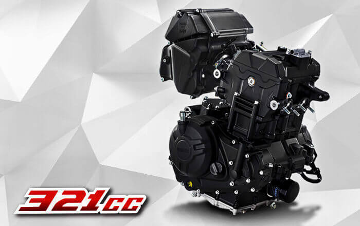 เครื่องยนต์ 321 ซีซี ระบายความร้อนด้วยน้ำ 4 จังหวะ DOHC 2 สูบเรียง เกียร์ 6 ระดับ พร้อมกระบอกสูบไดอะซิล และเทคโนโลยีวิเคราะห์การจุดระเบิดอย่างแม่นยำ หม้อน้ำขนาดใหญ่ เพิ่มประสิทธิภาพให้อัตราเร่งและการขับขี่ได้อย่างสมบูรณ์