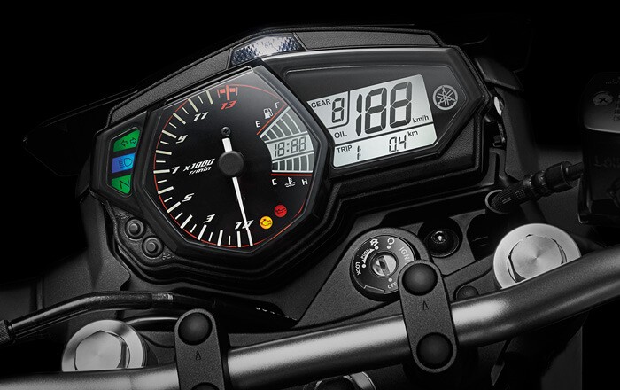 แผงหน้าปัดมัลติฟังก์ชั่นสไตล์ซูเปอร์ไบค์ ลงตัวกับแฮนเดิลบาร์พร้อมระบบวัดรอบ แบบ Electric กับ สปีดมิเตอร์แบบ Digital ได้อย่างลงตัว พร้อมไฟเตือนจังหวะเปลี่ยนเกียร์ (Shift Light) และมาตรวัดครบครัน