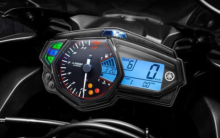 แผงหน้าปัดดิจิตอลจัดเต็ม ตัวเลขบอกตำแหน่งเกียร์ พร้อมไฟเตือนเปลี่ยนเกียร์ดีไซน์ Shift Light ที่ถอดแบบมาจาก YZF-R1 และ YZR-M1